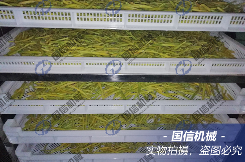 大型黃花菜烘干房?jī)?nèi)部可以放置15個(gè)推車(chē),共360個(gè)托盤(pán),日烘干處理鮮黃花菜片5噸左右。