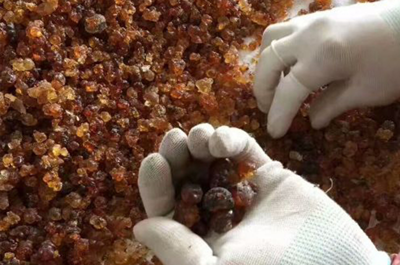 四、干燥放在不銹鋼盤(pán)中用蒸氣吹掃,或直接在鍋內(nèi)用火加熱,加熱過(guò)程中要不斷翻動(dòng),干后得到含水50%的膏狀產(chǎn)品。如用烘干,可得到純固體桃膠。